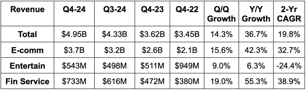 - E-commerce revenue beat by 5%; entertainment revenue beat by 2%; financial services revenue beat by 13.5%.