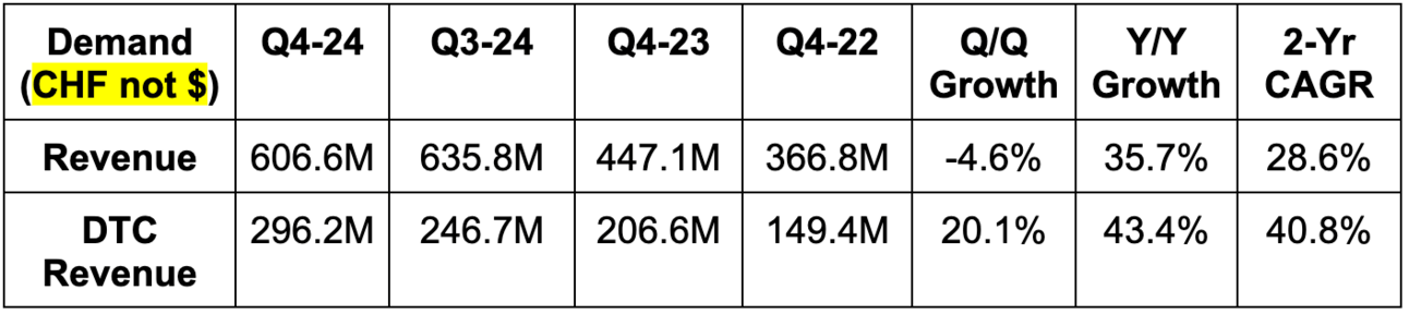 - The company guided to CHF 2.94 billion in 2025 revenue. This missed by 0.5%. It also sees at least 27% foreign exchange neutral (FXN) growth for 2025.