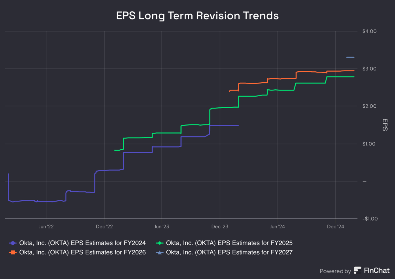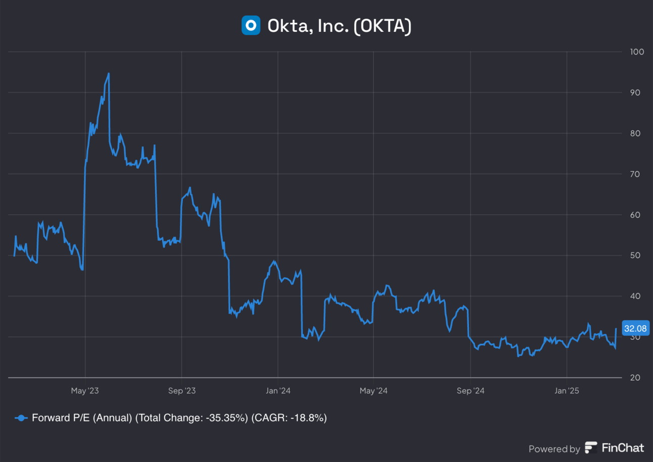 Okta trades for 32x its forward EPS guidance. Guidance implies 13% Y/Y EPS growth for this year. Analysts expect 6% EPS growth the following year.