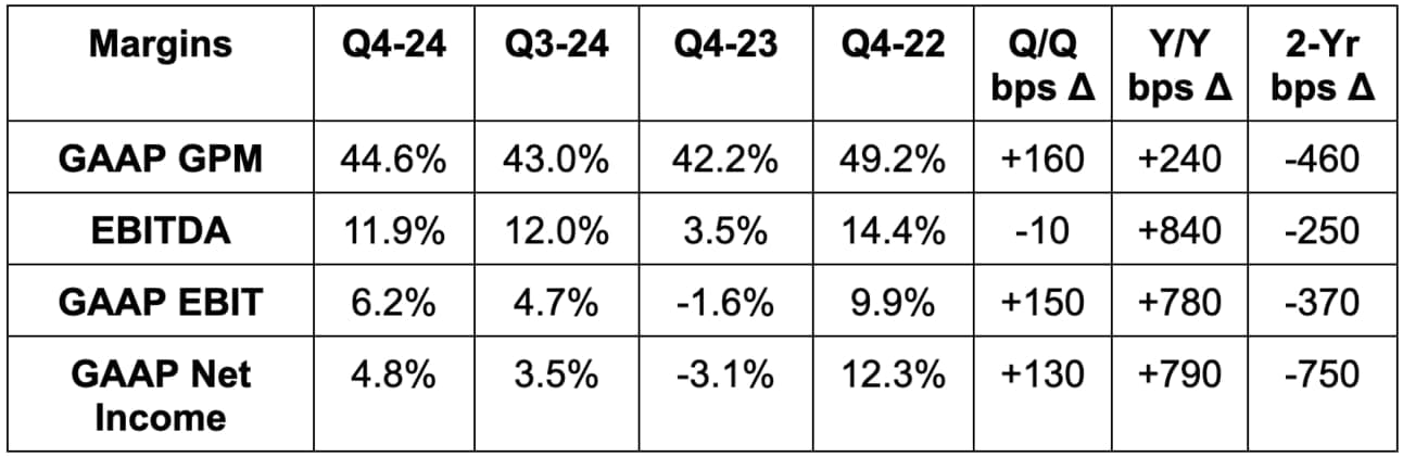 - Beat 43.6% GAAP GPM estimates by 100 bps.