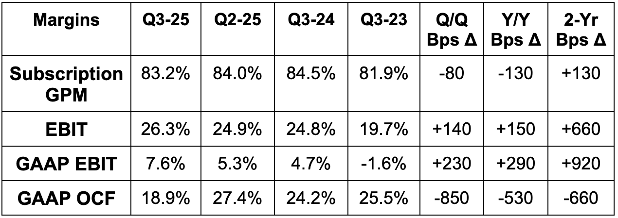 - Beat 25.5% EBIT margin estimates by 80 bps & beat 25.3% EBIT margin guidance by about 100 bps.