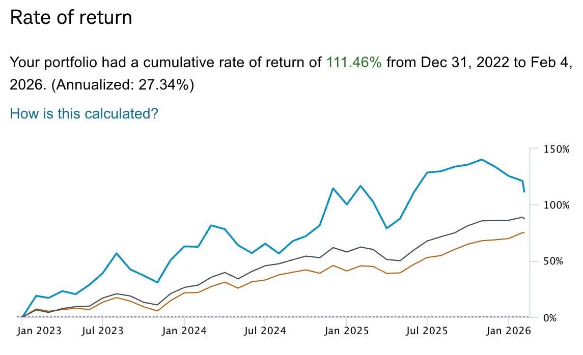 Photo by Sam Williams / Unsplash Cutting a Position & Performance Updates 5 February 2026 4 min read Table of Contentsa. Performance Updatesb. Portfolio Changec. Portfolio Management Strategyd. Updated Holdings a. Performance UpdatesOverall: