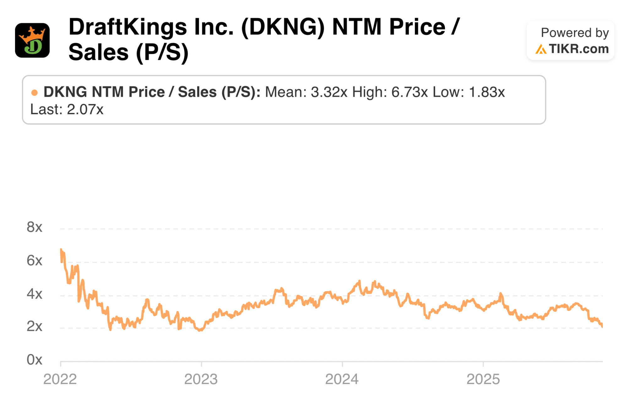 DKNG trades for about 20x forward EPS. EPS is expected to grow from $0.24 to $1.67 this year, by 83% the following year and by 50% the year after that. It has not been profitable for long enough to use anything but a sales multiple chart below. Estimates for 2025 will fall sharply due to the EBITDA revision (somewhere around $1), but I think any negative revisions for 2026 will be modest if there are any. Again, this miss is all luck-related.