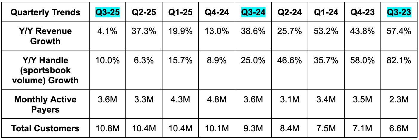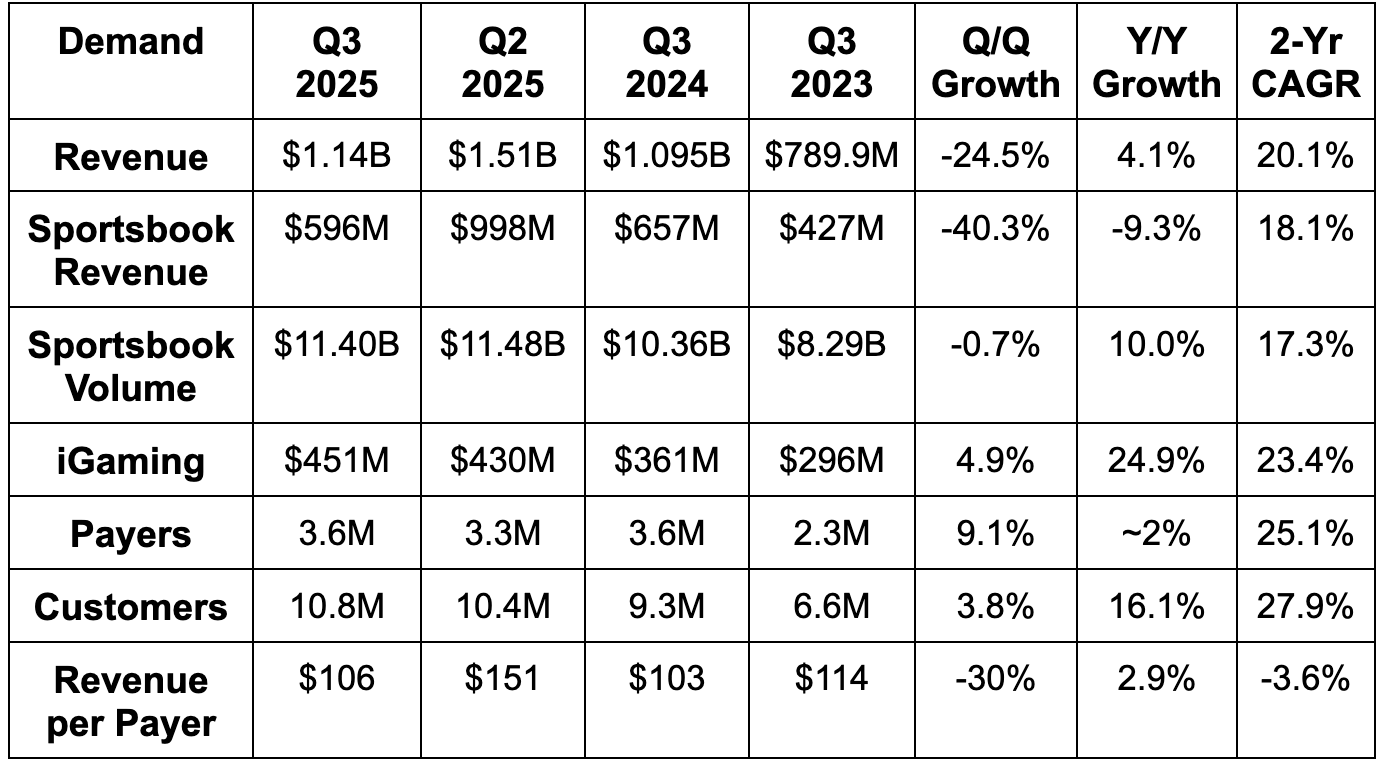 Missed revenue estimates by 5% due to sportsbook outcomes. iGaming revenue beat estimates by 4%. Note that Jackpocket M&A is a material revenue-per-payer headwind.