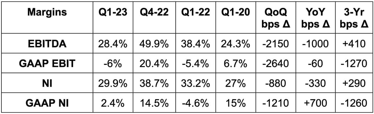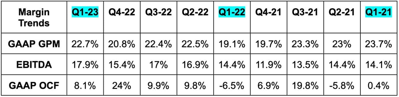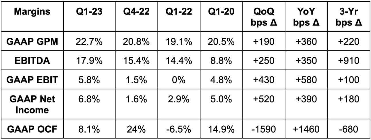 - Beat $0.07 GAAP EPS estimates by $0.11 & beat its guide by $0.10. The $0.18 in EPS this quarter compares to $0.05 per share YoY. Importantly, this was NOT aided by income tax benefits which were $1.3 million this quarter vs. $5.1 million in the YoY period. This growth was powered by operating profitability.