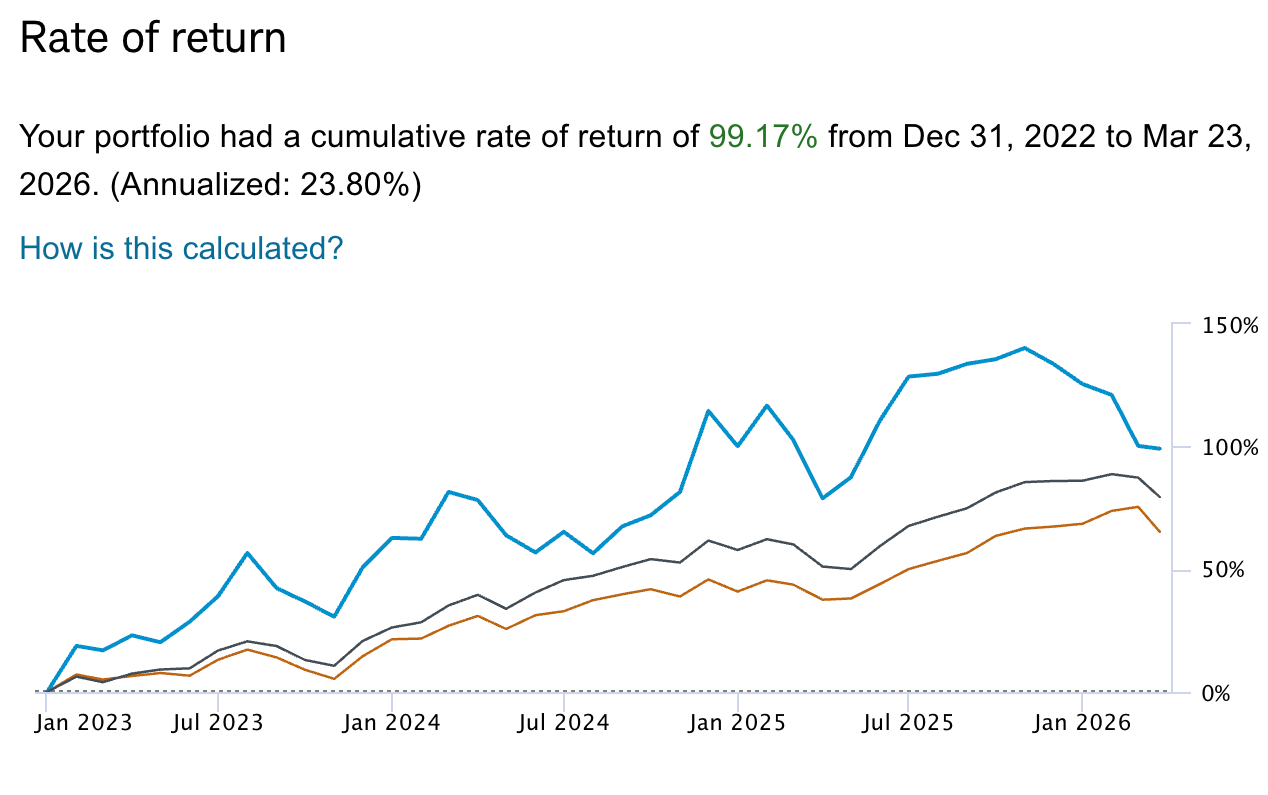 Photo by Matt Artz / Unsplash Exiting a Position, Adding to Others & Updated Performance 24 March 2026 4 min read Table of Contents1. Updated Performance2. Changes3. Portfolio Management Strategy4. Updated Holdings 1. Updated PerformanceOverall: