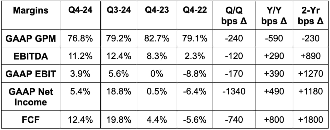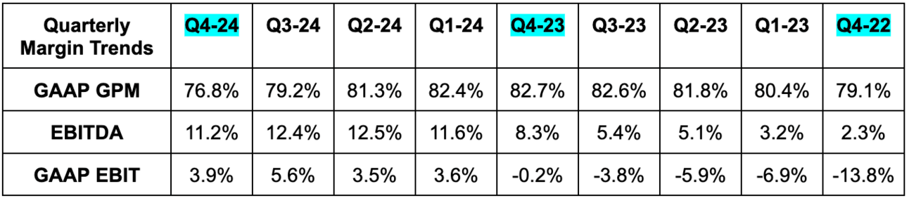 - Missed 78.3% GAAP GPM estimates by 150 basis points (bps; 1 basis point = 0.01%). GPM contraction is due to investments in the weight loss platform and was as expected internally.