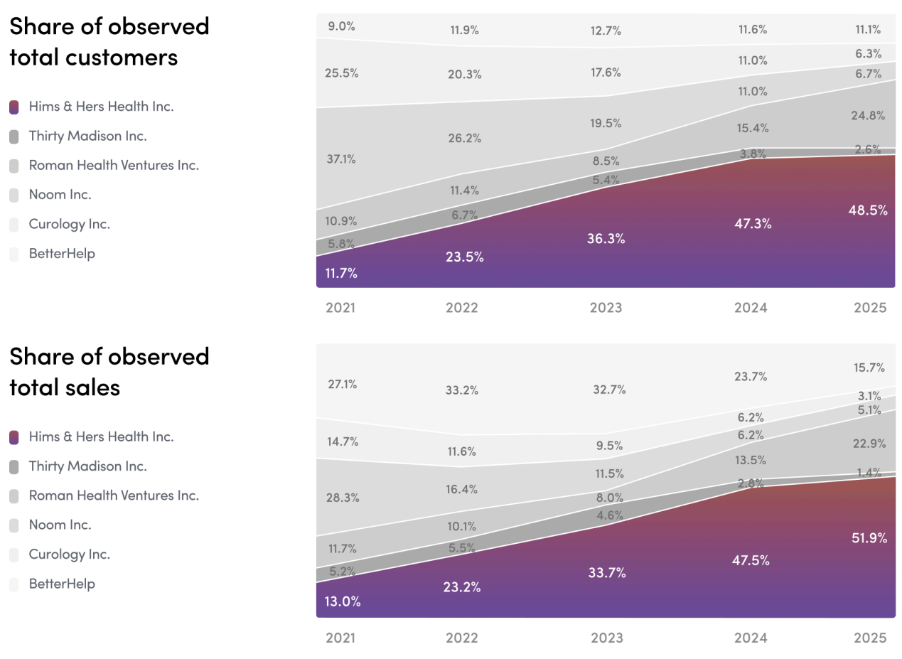 2025 Hims brand revenue rose 30% Y/Y despite sexual health business disruption headwinds from an intentional shift to daily solutions. That headwind will be lapped later in 2026. The Hers brand for 2025 delivered 100%+ Y/Y growth. It’s now close to $1B/year in revenue on its own and is already 40% of the company’s total U.S. business.