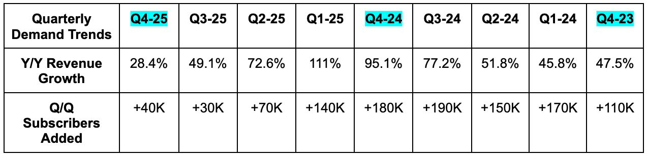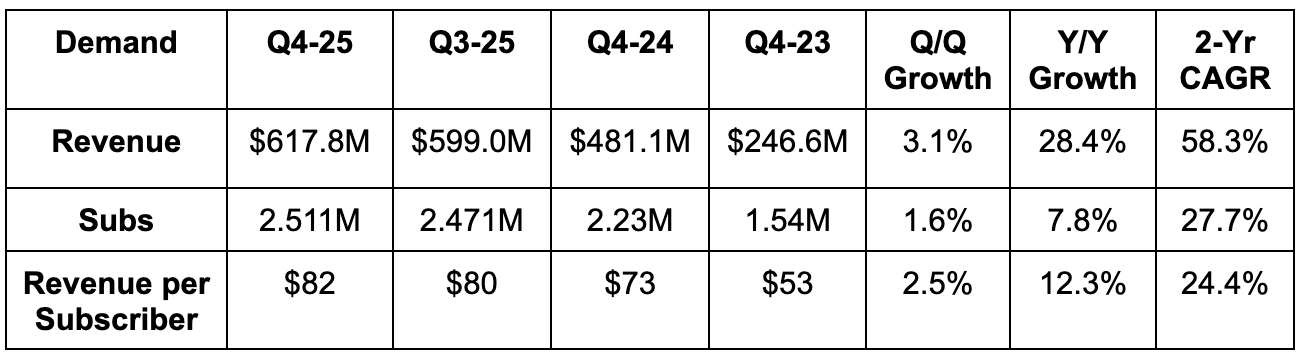 While net income rose by just 8% Y/Y, EBT (pre-tax income) for 2025 rose by more than 100%; slower net income growth was due to lapping a $50M+ tax benefit. FCF for the full year fell from $139M to $60M due to CapEx rising from $17M to $167M as the company aggressively pursues growth.