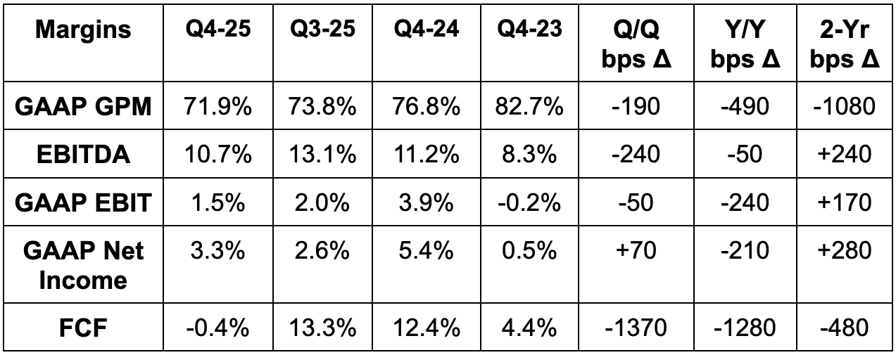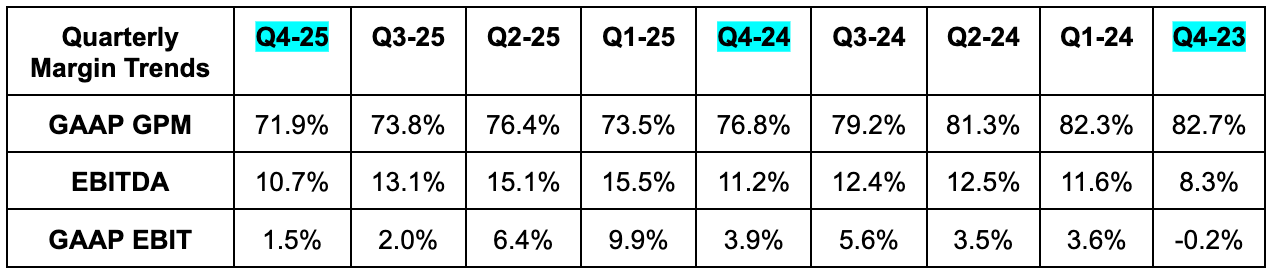 - Missed GAAP GPM estimates by 200 basis points (bps; 1 basis point = 0.01%).