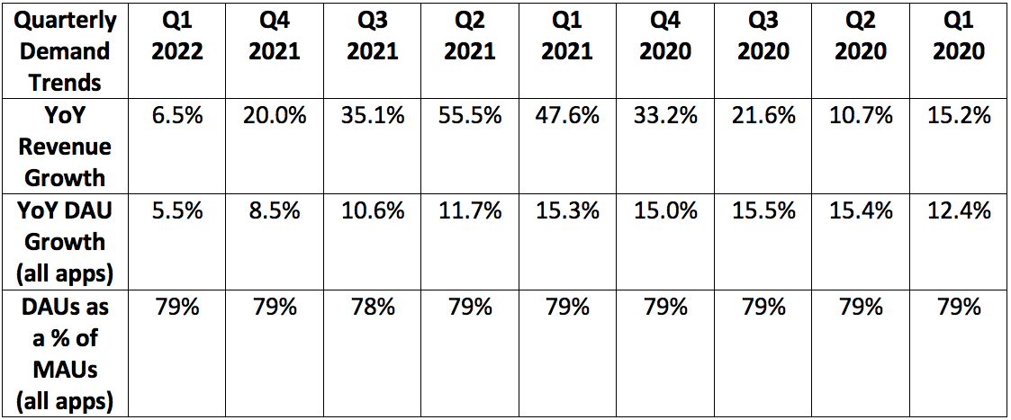 While it's not a metric most fixate on, I find DAUs remaining at 79% of MAUs to be an encouraging sign of durable, post-pandemic engagement.