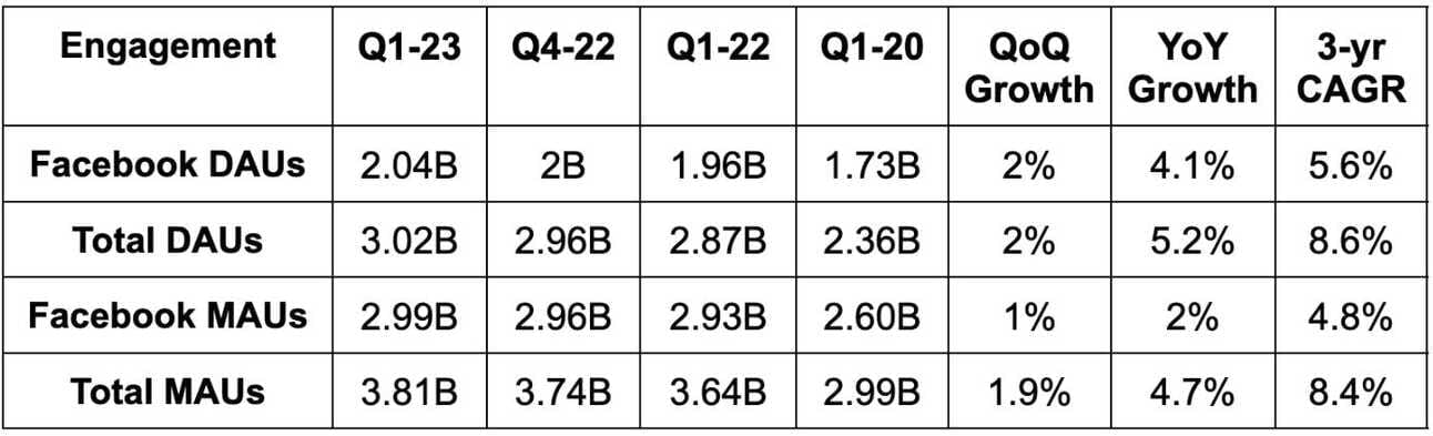 - Beat total daily active user (DAU) estimates by 1.7% and beat the other 3 engagement metrics by a similar margin.