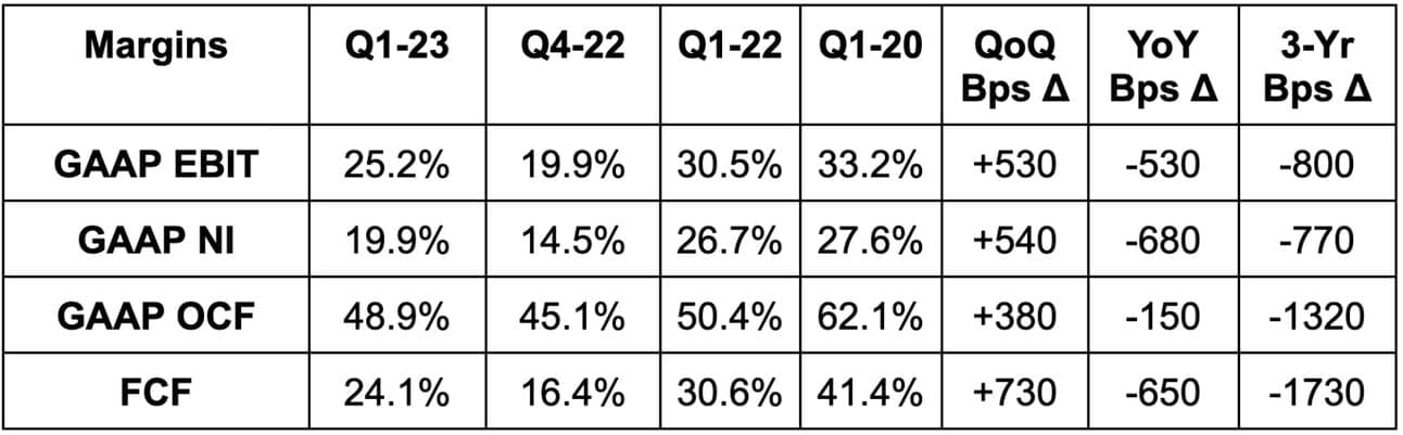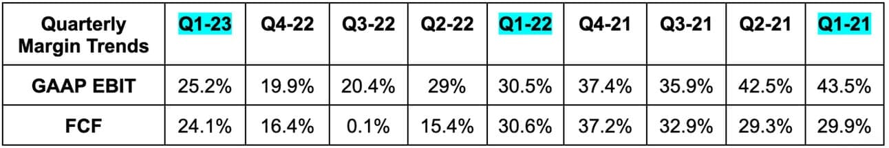 Profit metrics include $1.14 billion in restructuring charges taken from layoffs and real estate footprint cuts. Without this charge, EBIT margin would have been 29.2% and net income margin would have been 23.9%. Year of efficiency. And again, EPS would have beaten by $0.67 with earnings of $2.64.