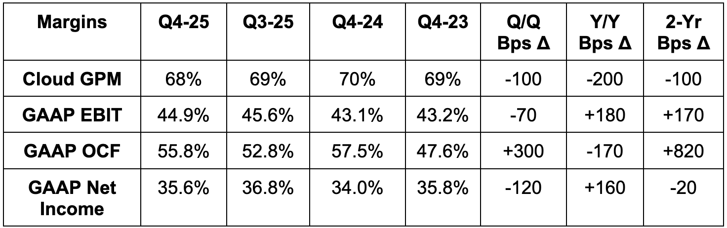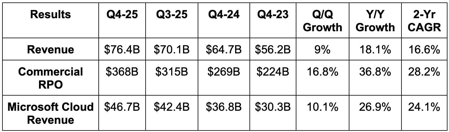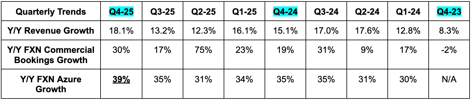- Beat 34.5% foreign exchange neutral (FXN) Azure growth estimates & guidance by 4.5 points each.