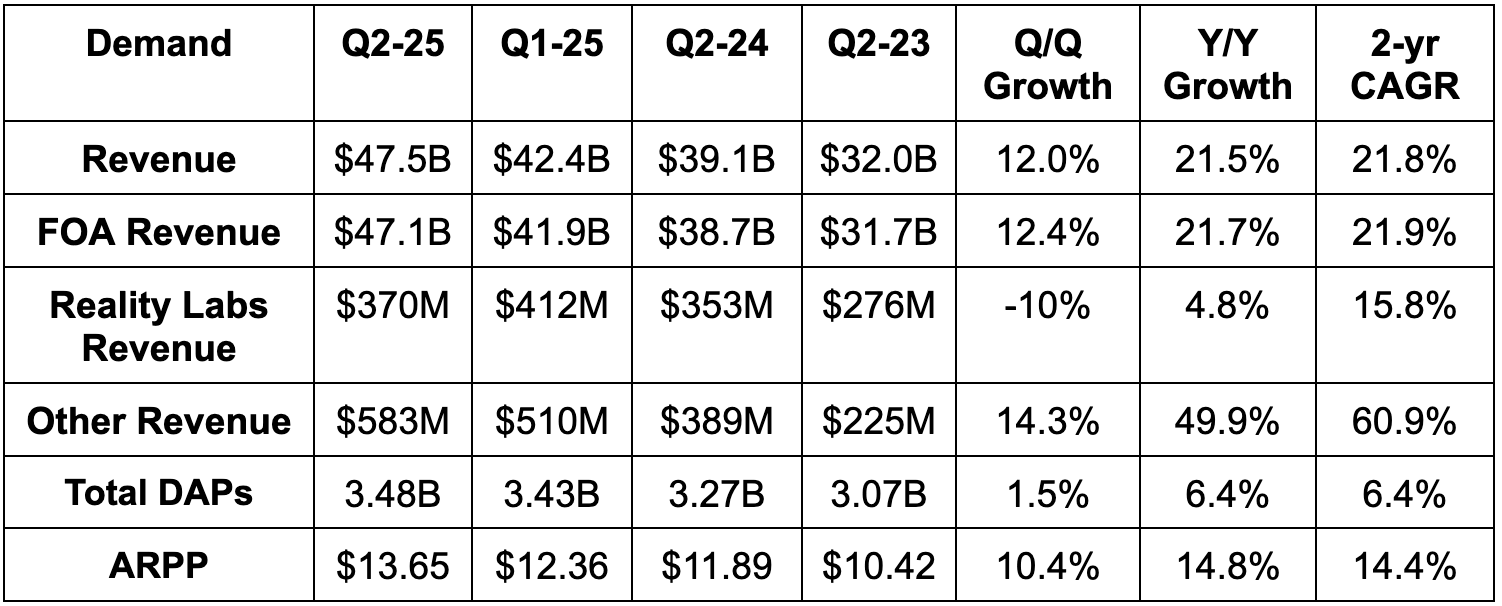 - Other revenue, which consists of WhatsApp Business Messaging and Meta Verified, beat estimates by 16%.