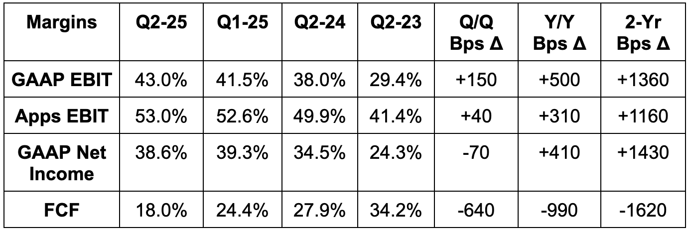 - This beat was not foreign exchange (FX) favorability driven. FX was actually less favorable than expected, so the beat is entirely driven by fundamental outperformance. There was virtually zero FX tailwind vs. Meta guiding to a 1-point tailwind.