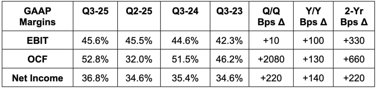 - Beat $3.22 EPS estimate by $0.24; beat operating cash flow (OCF) estimates by 10%.