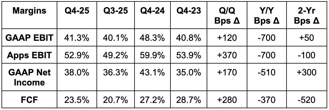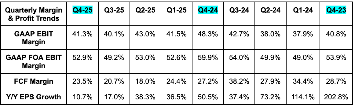 Encouragingly, we were also told EBIT would grow Y/Y despite this vastly larger-than-expected OpEx guidance. Comforting guardrail. Sell-side analysts only expected 4% Y/Y EBIT dollar growth for 2026 before this report. If you told them before the print that OpEx guidance would be nearly 10% larger-than-expected, they would have likely been surprised to hear that the EBIT guidance was roughly in line with their expectations. To me, that’s simply a sign of how strong demand trends are right now. This incremental revenue is flowing steadily down the income statement as leverage builds.