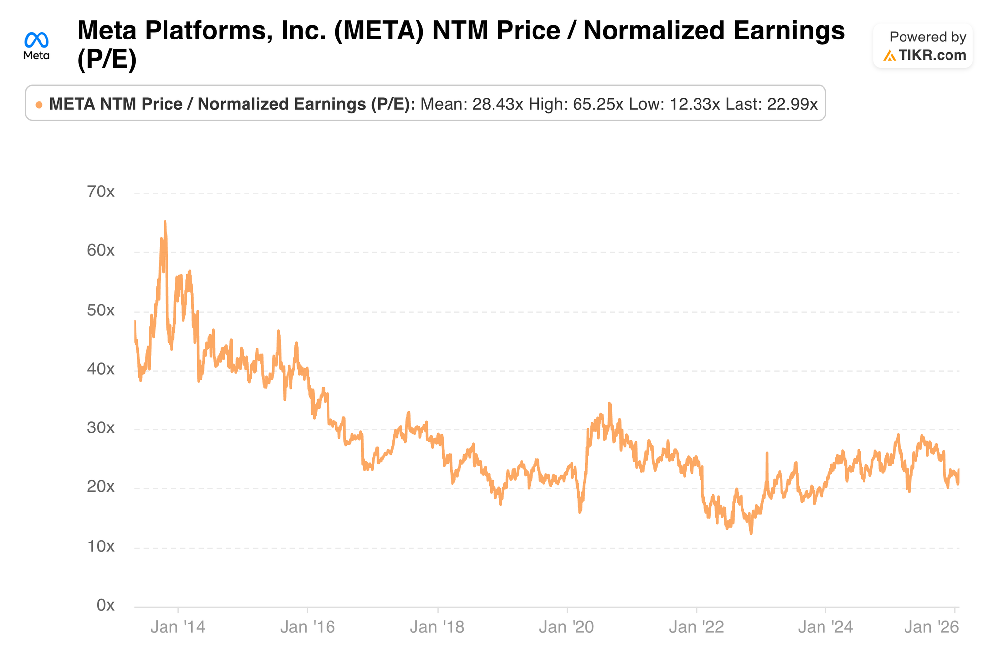 Meta trades for about 25x 2026 EPS. EPS is expected to grow by 3% this year and by 12% next year, following a 3-year period of compounding EPS at a 50% clip. Note that the chart below is a next 12-month p/e using Q4-25 to Q4-26. It hasn't been updated yet.