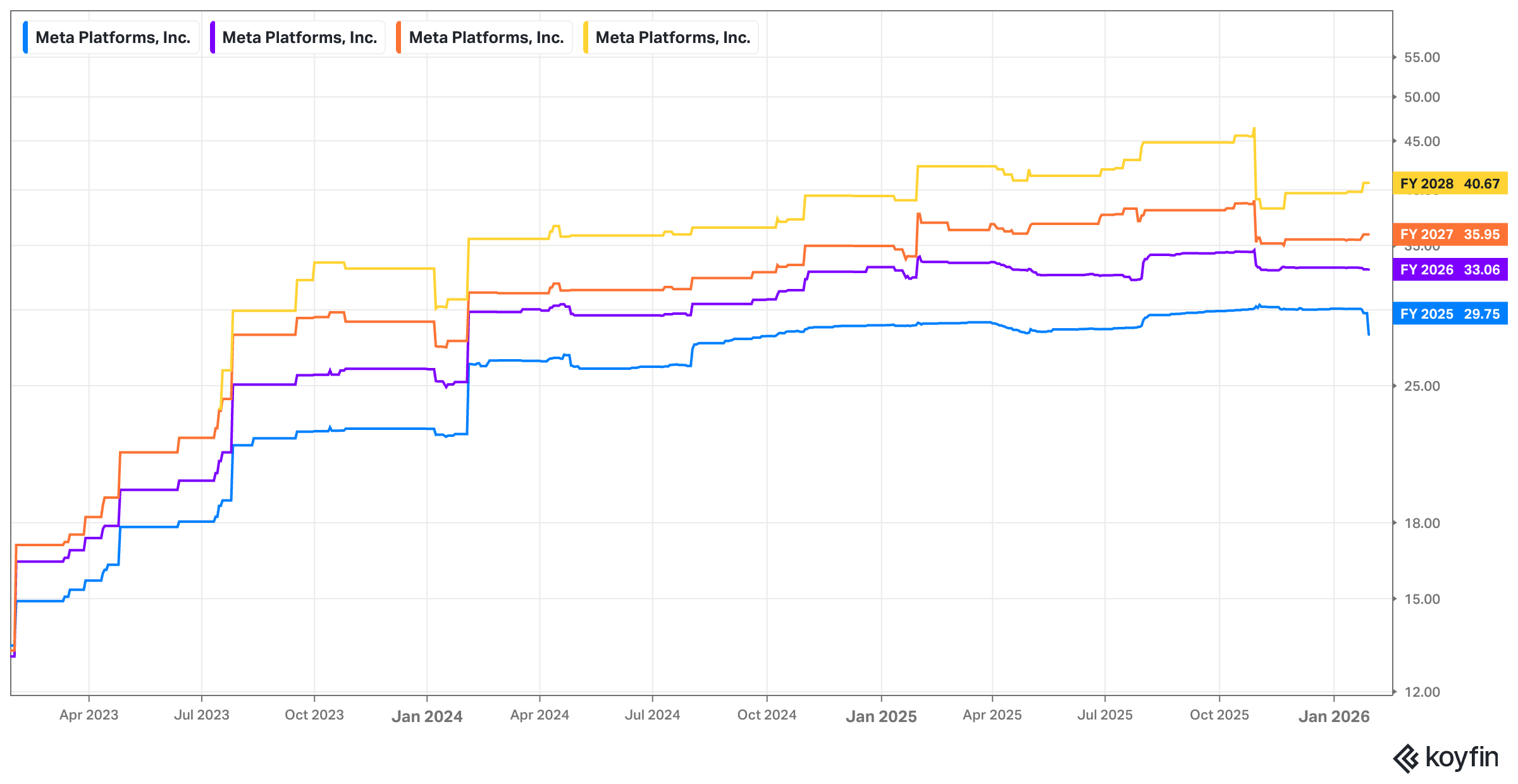 Meta expects a 14.5% tax rate in 2026 vs. 30% Y/Y, which will mean EPS growth will be faster than pre-tax income (EBT) growth. Consensus growth estimates for EBIT and EBT are identical for 2026, which means there's no sharp change in interest expense intensity coming. That lets us assume EPS growth will be faster than EBIT growth. Analysts were expecting 3% EPS growth compared to the 4% EBIT growth. That should lead to upward EPS revisions for 2026.