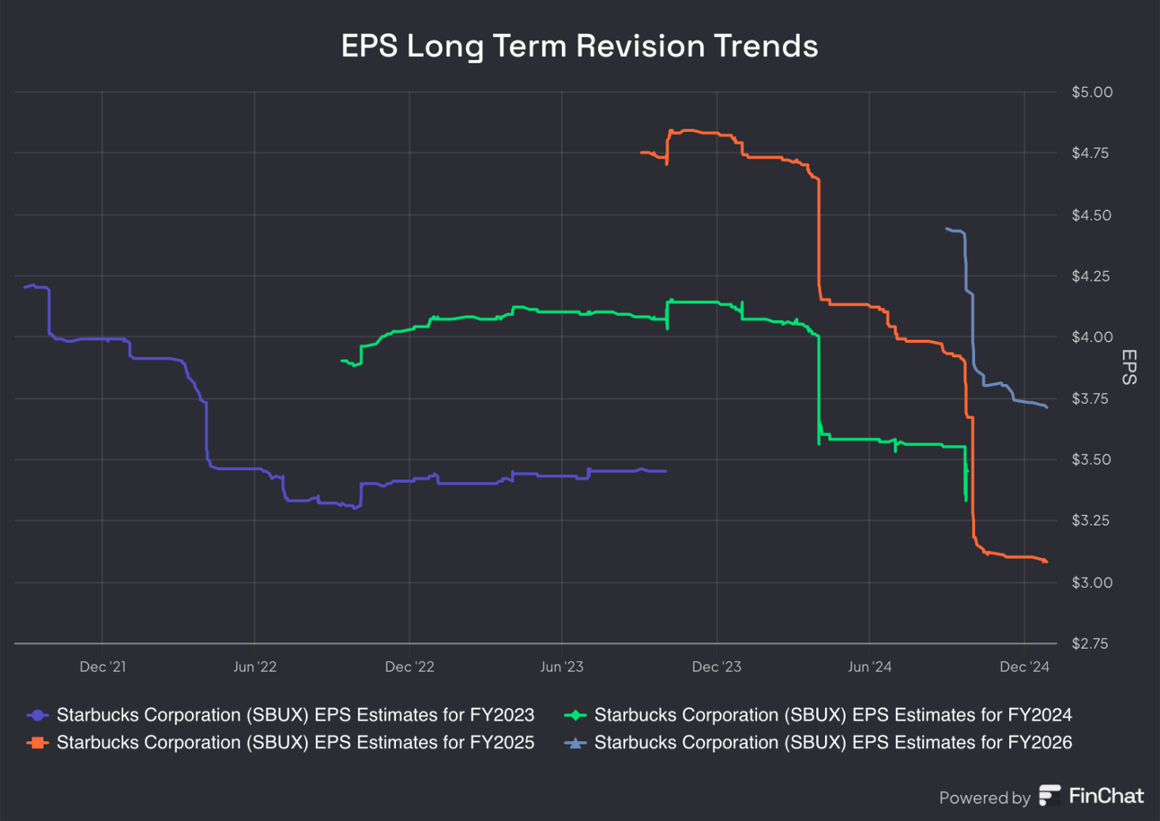 - Beat $0.67 EPS estimate by $0.02. EPS fell by 23% Y/Y. This reflects “heightened investments as part of Niccol’s Back to Starbucks strategy.”