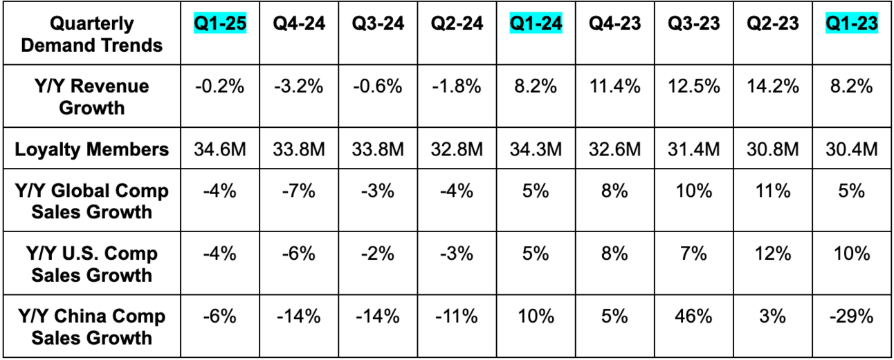 As a reminder, like when he led Chipotle, new CEO Brian Niccol has instituted a “Back to Starbucks” plan to turn things around. The key focus areas within this plan include: Reintroducing Starbucks to the world, greatly improving customer experiences, revamping the in-store environment and creating a better work environment for internal career mobility. Candidly, this company was a complete mess before he took over. Old leadership had made inexplicably poor decisions like abandoning food testing and stage-gate processes, while turning menu introductions into trial and error. Gigantic companies that are fundamentally lost cannot be turned around overnight. This will take time, but Niccol’s track record is elite and progress is already beginning to pop up.