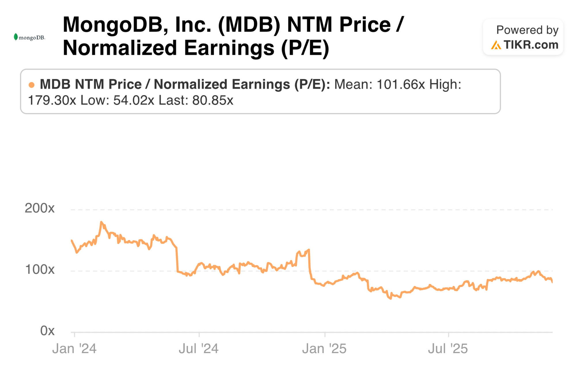 MDB trades for 81x forward EPS. EPS is expected to grow by 32% this year (we’re now in their Q4 for FY 2026), 13% next year and 21% the year after. It also trades for 100x forward FCF. FCF is expected to more than triple this year to $377M. Growth is expected to be 19% next year and 36% the year after.