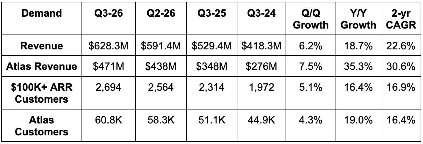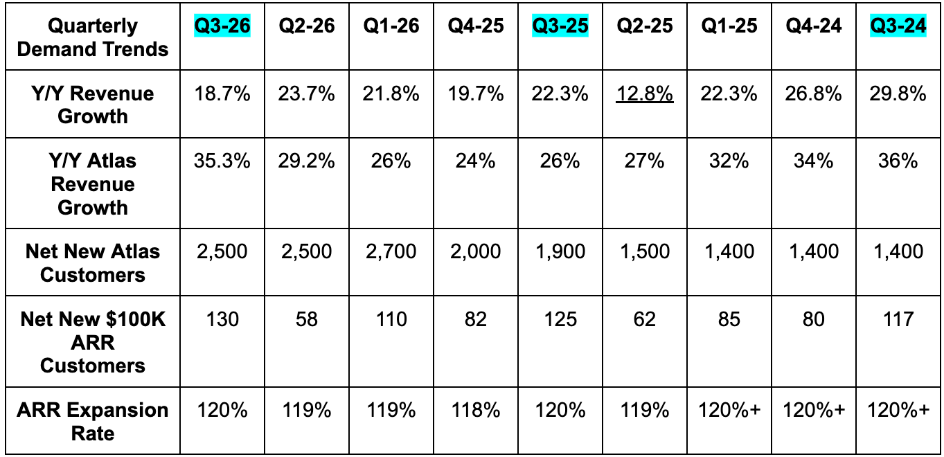 Guidance now includes 27% Y/Y revenue growth for Atlas vs. about 25% previously expected. It also includes 7%-9% non-Atlas growth, implying non-Atlas will do much better than its previous annual segment guidance calling for a roughly 5% Y/Y decline. As this is a consumption-based business model, they remain highly prudent in forecasting assumptions.
