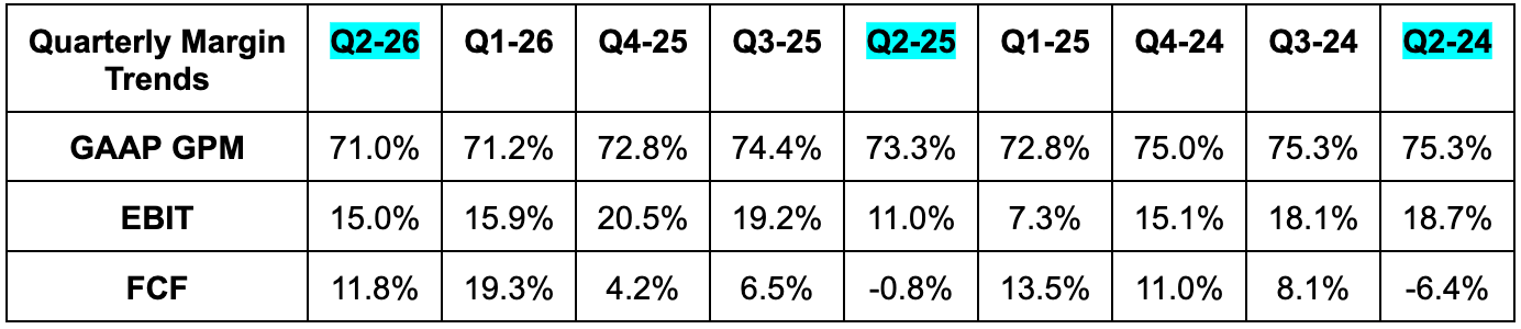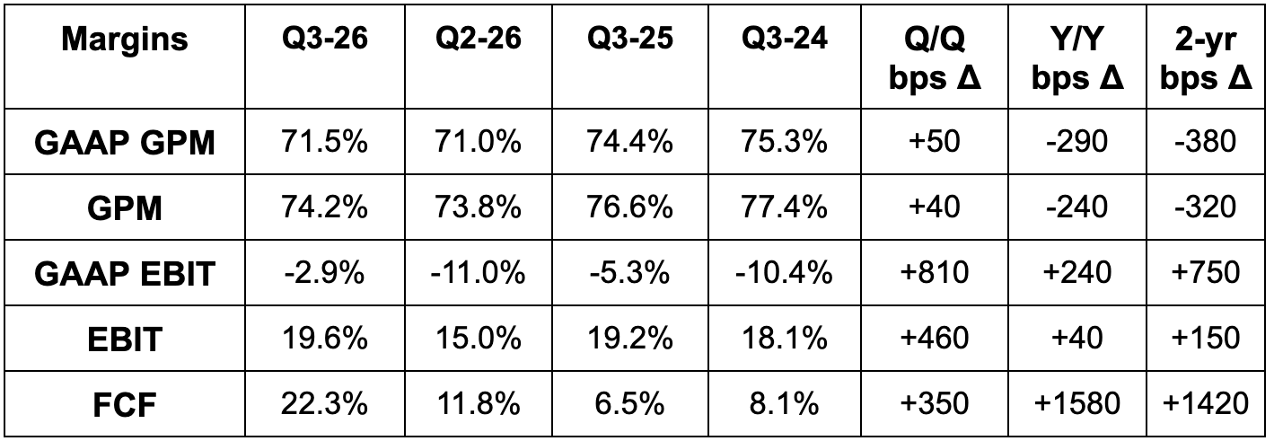- Missed 74.4% GPM estimate by 20 basis points (bps; 1 basis point = 0.01%).