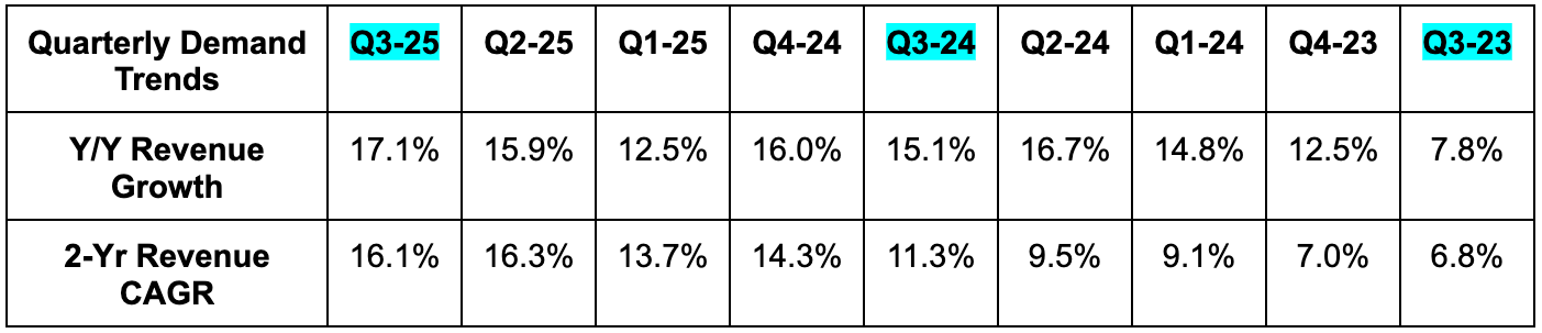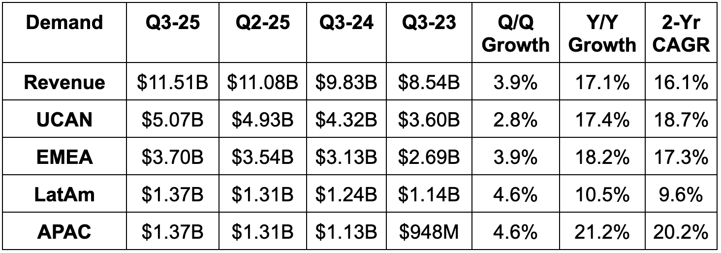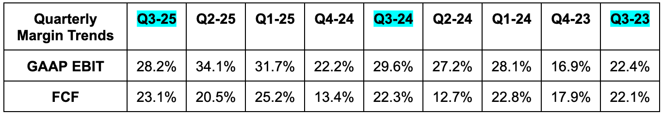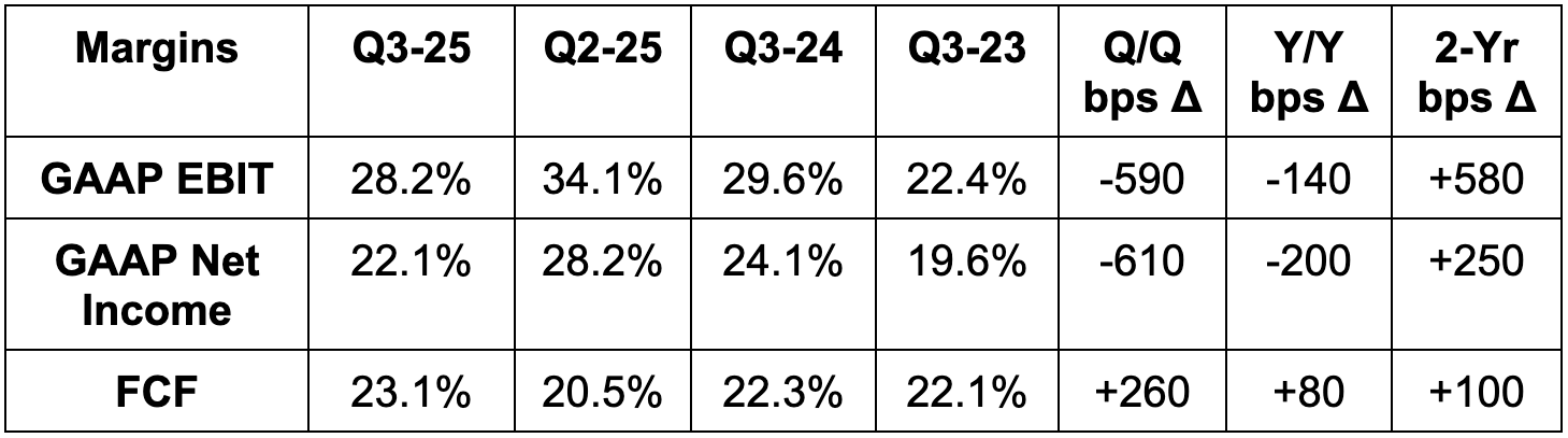 - Share count fell by 1% Y/Y. $10.1B left in buybacks (about 2% of the market cap).