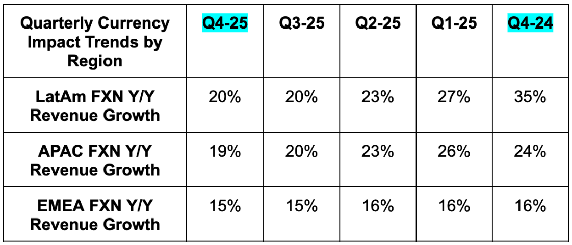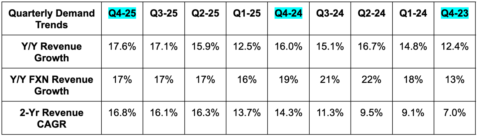 - The beat was despite foreign exchange (FX) headwinds that were worse than expected. FX neutral (FXN) growth was 16% Y/Y vs. 16% guidance.