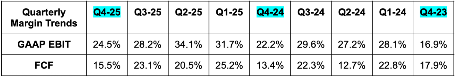 - Beat free cash flow (FCF) estimates by 30%. This was related to the $700M tax charge in Brazil discussed last quarter moving from Q4 2025 to 2026.