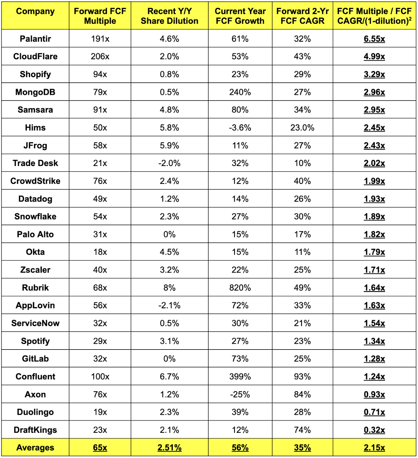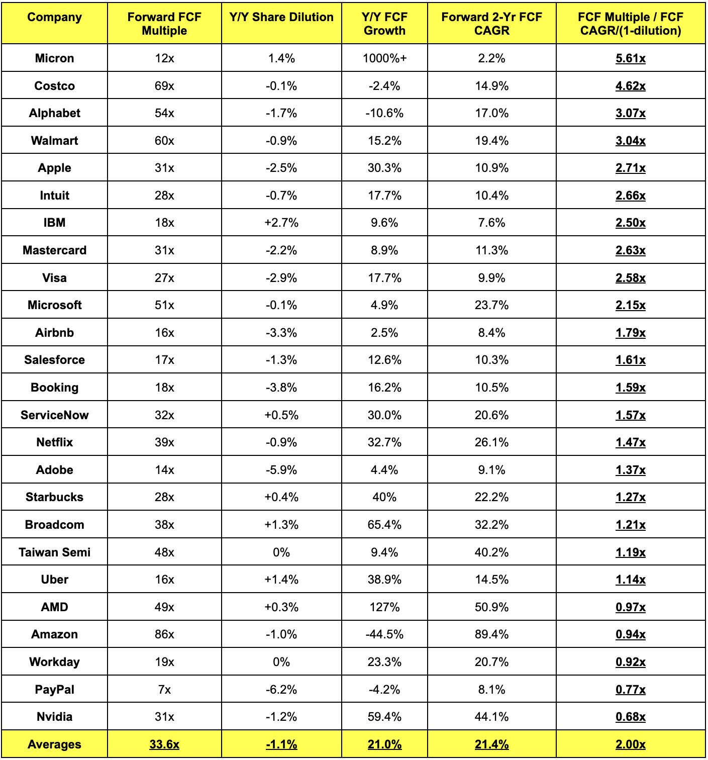 This is the messiest the FCF sheet has ever been for this cohort, which has everything to do with AI CapEx. I think the income statement comp sheet I publish next week will be more useful, but I still wanted to include this. Tesla was excluded because its FCF growth multiple is currently over 20x. Oracle and Meta were excluded because FCF for both is shrinking due to AI CapEx. Alphabet’s multiple zoomed past 3.0x due to its CapEx strategy as well. The income statement sheet next week will more gradually account for all of this spending via depreciation instead of a direct cash outlay.