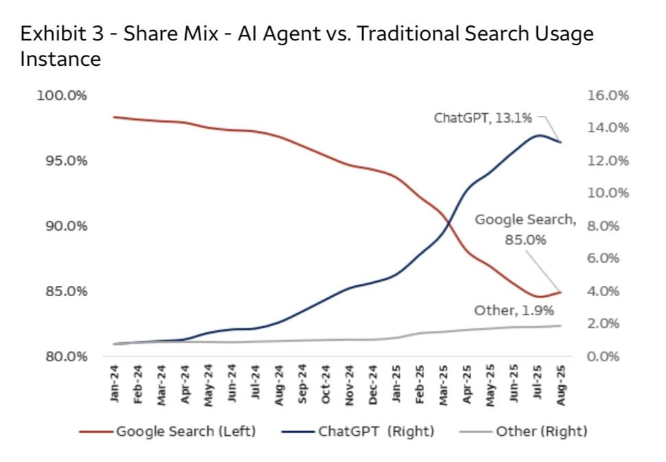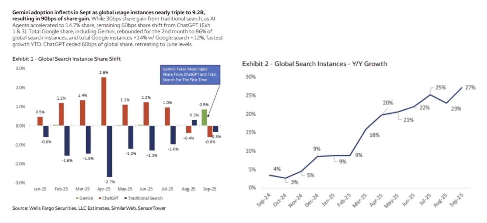 Wells Fargo published some new search data that bodes well for both traditional Google Search and Gemini. The chart is not well put together, but the data in it is very useful. As you can see below, traditional search market share (which includes AI overviews but not Gemini) rose in July and August after falling consistently for more than a year. That share looks to have come from ChatGPT. In the other image, you can see Gemini beginning to take meaningful market share for the first time in September. Good news on both fronts.