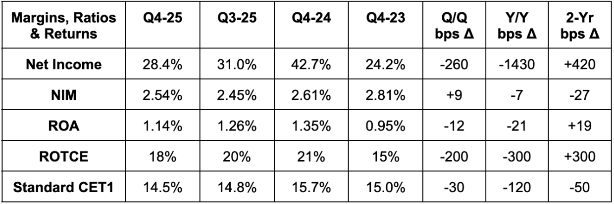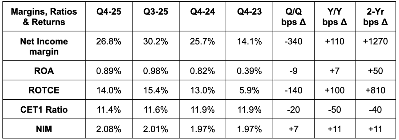 Revenue missed estimates by 0.9%. It also missed $4.91 EPS estimates by $0.28 and exactly met 2.54% net interest margin (NIM) expectations. Finally, it missed 1.20% return on asset (ROA) estimates by 6 basis points.