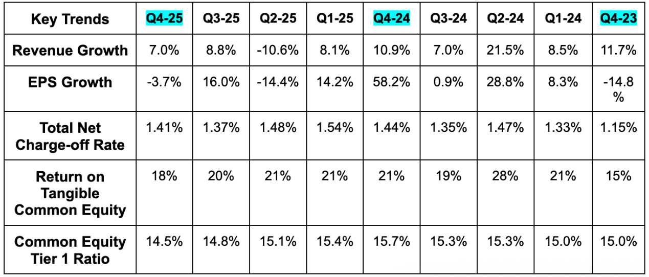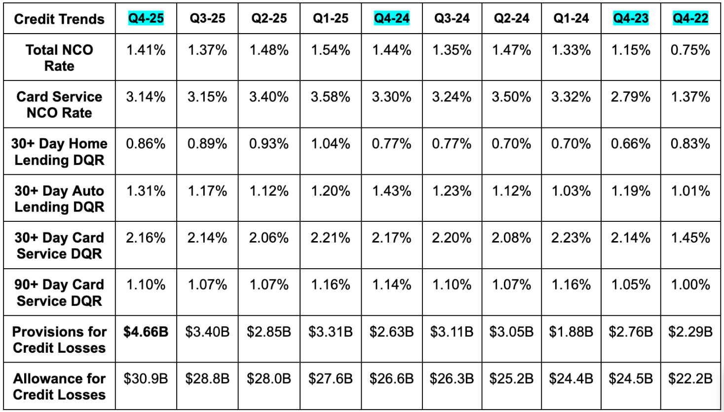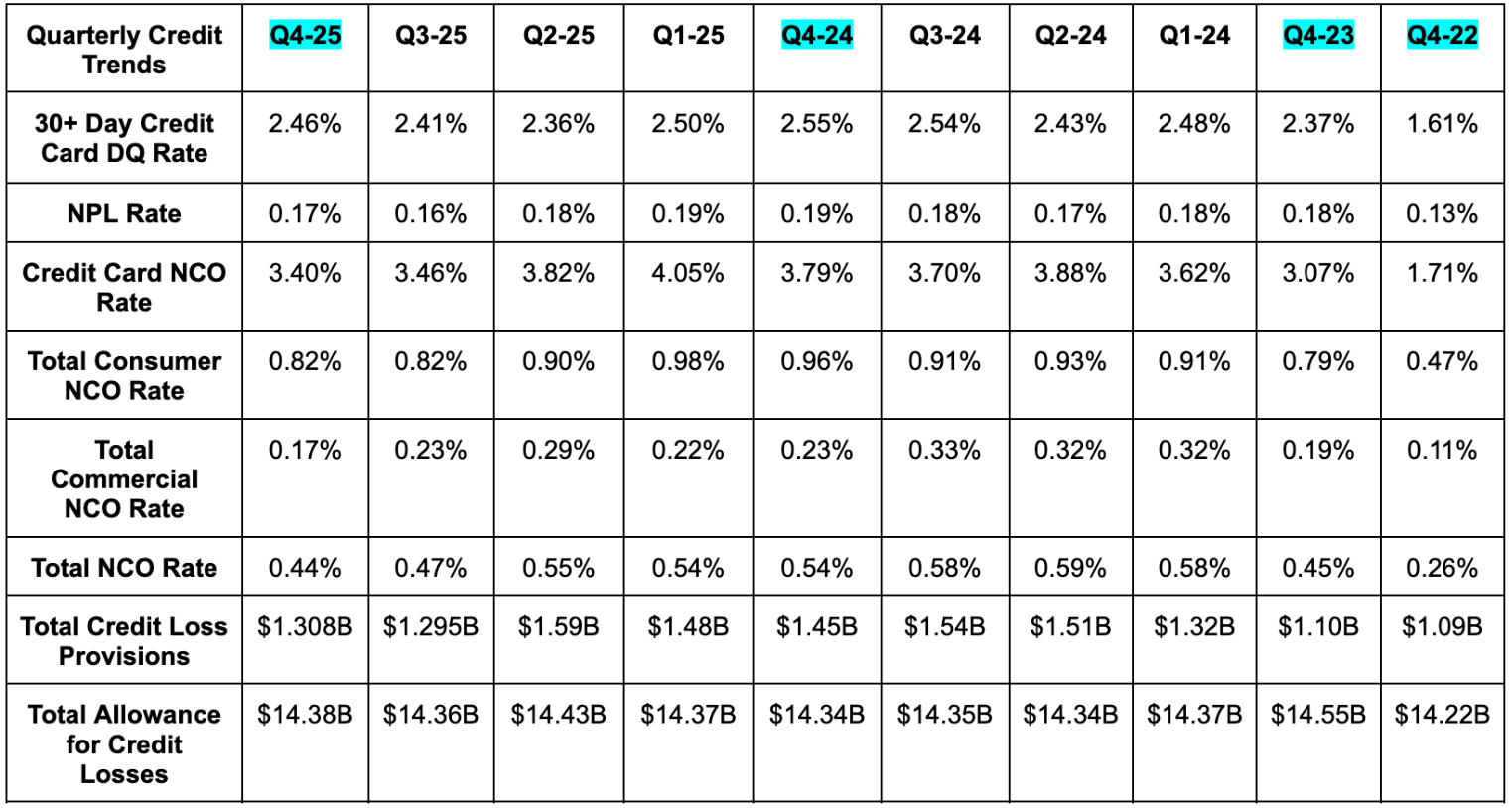 And for 2026, they see card services net charge-off rate remaining wonderfully resilient. This is expected to come in at 3.40% vs. 3.31% Y/Y and 3.34% two years ago. Great stability in their outlook, which is supported by the optimism in the call quotes below: