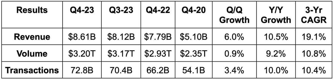 Mastercard met revenue estimates and roughly met its revenue guidance. Purchase volume of $1.88 trillion also slightly surpassed expectations. Cross border growth met estimates. Its 19.4% 3-year revenue CAGR compares to 23.4% Q/Q & 12.8% 2 quarters ago.