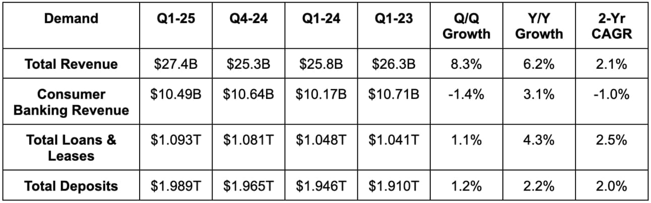 Despite expectations for more rate cuts than it assumed 3 months ago, Bank of America reiterated a quarterly net interest income ramp to $15.6B by the end of the year. It continues to expect about 6.5% Y/Y net interest income growth.
