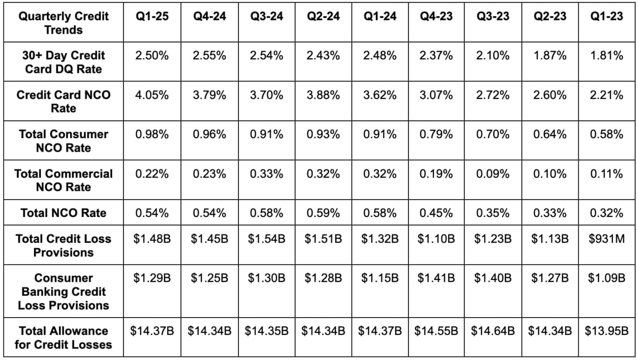- Very similar to the data we saw from J.P. Morgan. Good to see delinquency (DQ) rate fall Q/Q and only rise modestly Y/Y.