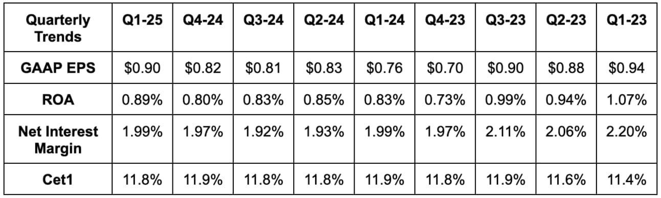 - I’d love to see the credit card NCO rate stop rising. Its subprime exposure to this bucket is just 12% of total exposure, so this shows prime borrowers getting a tad more fragile. At the same time, Q1 sees seasonally higher NCO vs. Q4, and the Q/Q jump this year was smaller than last year, which is good news. And to make things even less concerning: