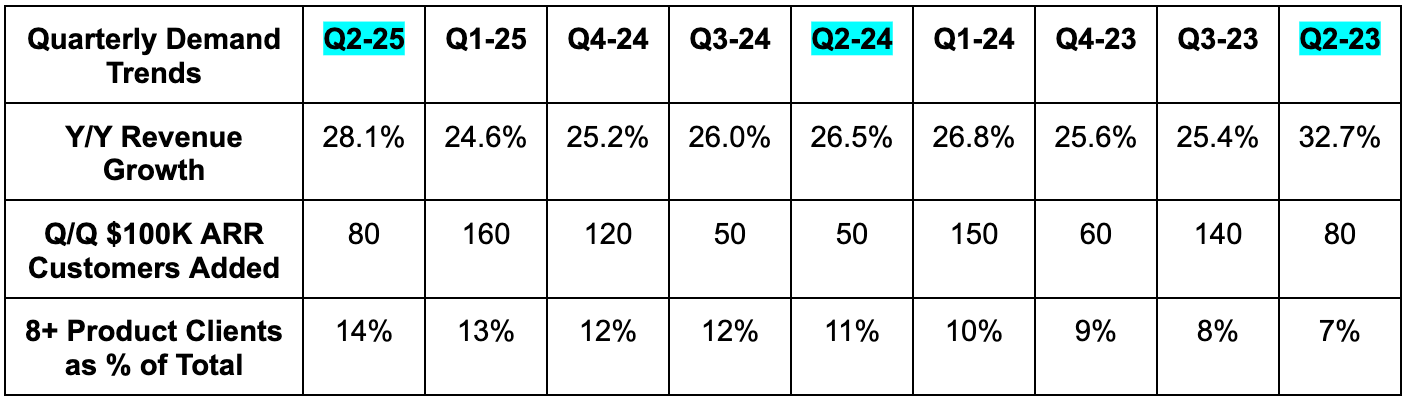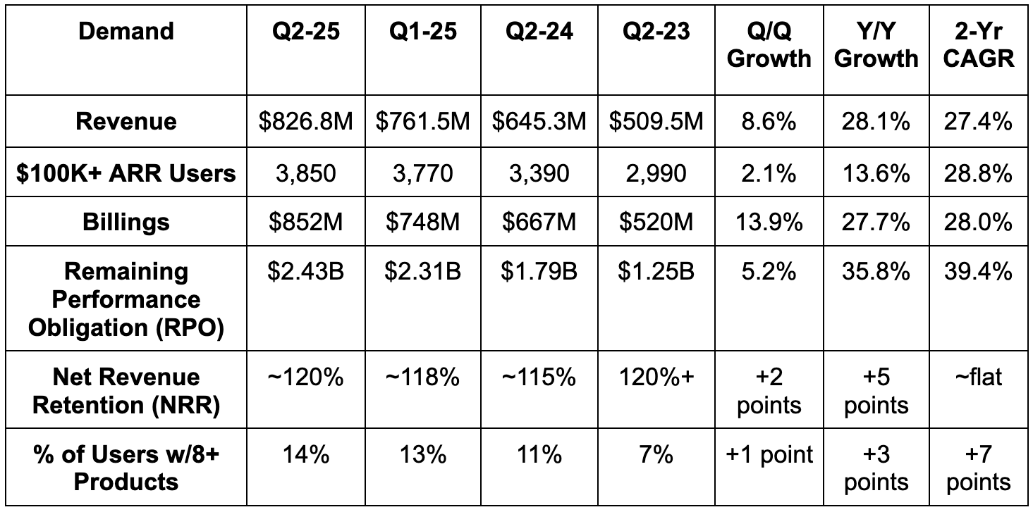 Overall usage growth was better than expected during Q2, which drove the top-line outperformance. This was driven by AI-native cohort strength. That specific chunk of business has already morphed into a rapidly growing and scaled piece of this company. Specifically, this bucket is now 11% of revenue vs. just 4% Y/Y, and delivered 10 incremental points of Y/Y revenue growth vs. 6 points Q/Q and 2 points Y/Y. That single-handedly allowed revenue growth to accelerate on a Y/Y basis, which is both exciting and a bit nerve-wracking.