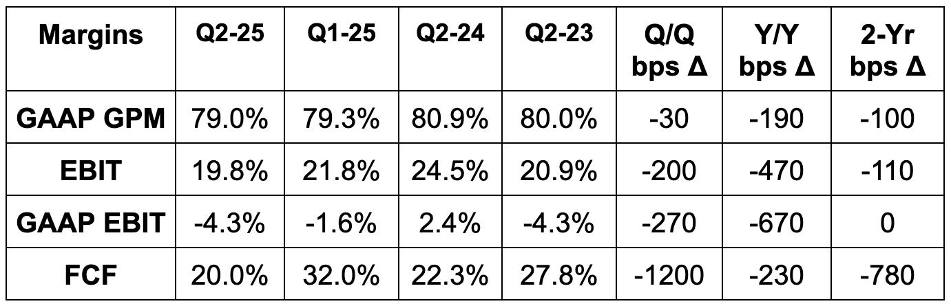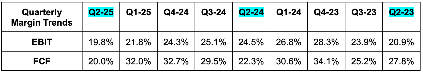 Gross margin was pressured by ongoing growth investments, with some offsetting help from engineering and cloud cost efficiency gains. For the same reason, OpEx rose by 30% Y/Y, powering the sharper EBIT margin contraction. It’s worth noting that excluding FX headwinds and their annual DASH product event, EBIT margin would have been 22%. At the same time, the product event happened last year too, so comps are apples-to-apples.