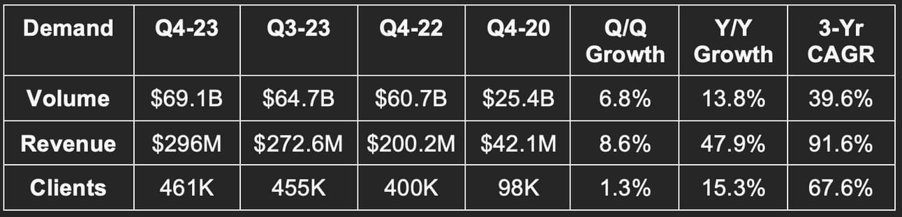Braintree continues to kill it. It’s now as large as Stripe & Adyen in terms of comparable volume. From a margin perspective, it’s well behind those two. Why? Because its entire book of business is gigantic brands like Uber & Airbnb. The more volume a client contributes, the better deal they can command. Braintree's book is made up of these kinds of sweetheart deals.