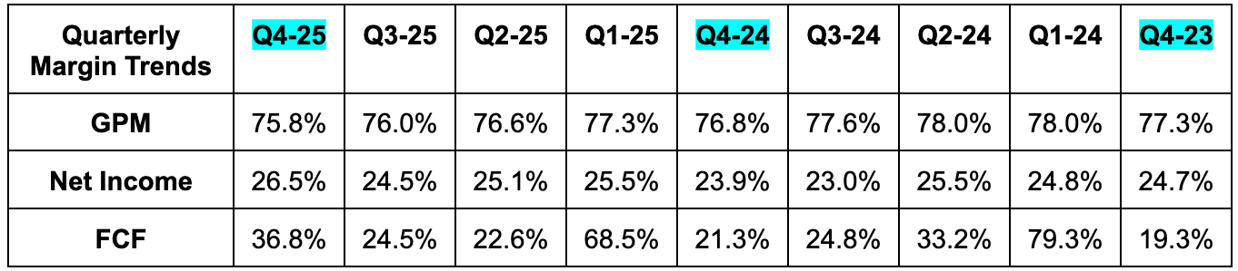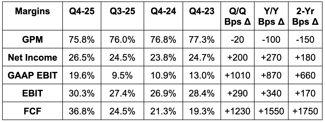 - Annual 38.5% FCF margin guidance beat 37.5% margin estimates.