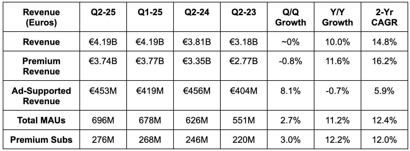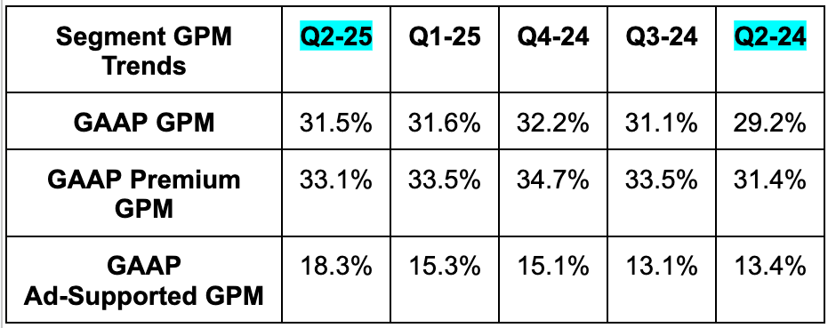 Premium segment GPM expansion was driven by revenue growth outpacing music related cost growth, as well as audiobook efficiency gains. These tailwinds were partially offset by incremental costs related to the Spotify Partner Program (SPP). As a reminder, SPP lets podcasters tap into ad revenue sharing like creators on YouTube and X can. Ad-supported margin expansion was driven by podcasting and music gains.