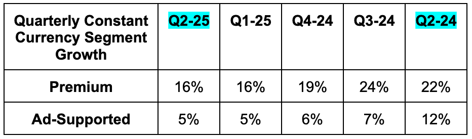 The EBIT miss included payroll taxes that were €98M larger than expected due to its rising share price. They call these “social charges.” Without this headwind, which should have been at least partially baked into analyst estimates, it would have beaten EBIT estimates by 1.8% and missed its guidance by 6.5%. The remainder of the miss was driven by some modest tax headwinds and also “lighter ad sales.” More on that later. With all of these charges, OpEx rose by 8% Y/Y. Excluding the social charges and some FX headwinds, OpEx rose by 5% Y/Y due to more marketing and headcount growth.