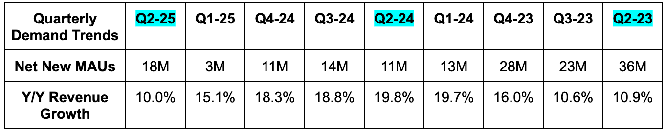 - Added 18M net new MAUs vs. 11M expected and added its second most Q2 MAUs in company history.