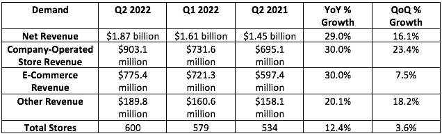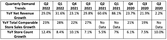 And speaking of mark-down cadence, the only concern coming out of this report was inventory rising around 85% YoY. There are a few notes I’d like to offer on why this doesn’t concern me. First, is its ability to sell most gear at full price and its continued robust forward demand outlook. But most importantly, we are still comping vs. a time when Lululemon was having significant trouble sourcing inventory from the supply chain chaos. Those supply chains have since eased a bit and Lulu is taking advantage. According to the team, “it was leaving demand on the table” last year via frequent out-of-stocks and this is its normalization of inventory levels. It sees today’s inventory position as far healthier than Q2 2021.