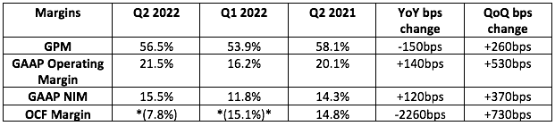 - YoY GPM compression was due to freight and supply issues shaving 150 bps off of it as well as FX impacts erasing another 40 bps. Without these headwinds, GPM would have been 58.4% and expanded 30 bps YoY.