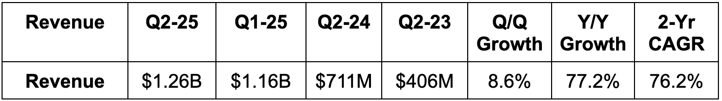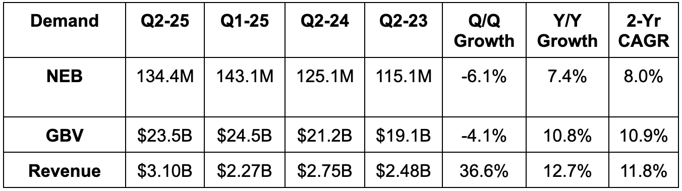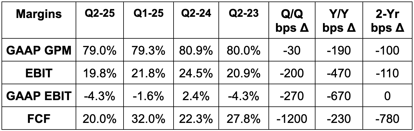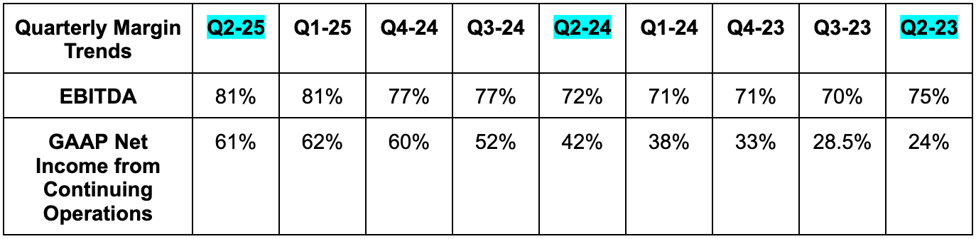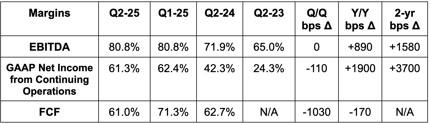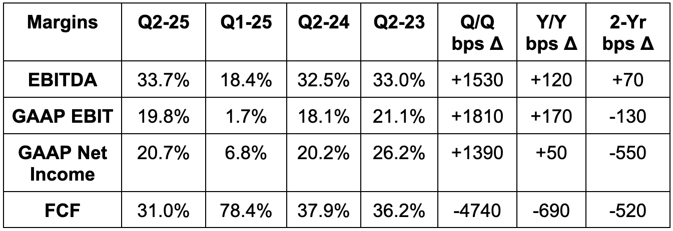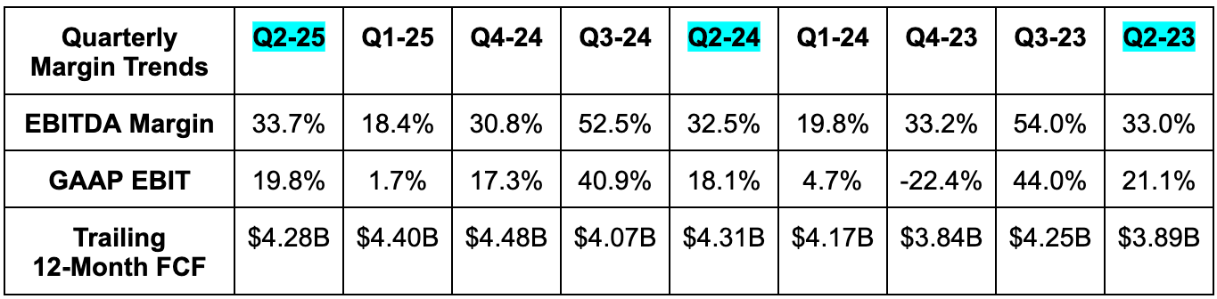 Q3 revenue guidance was slightly better than expected. They also reiterated 34.5%+ EBITDA margin guidance for the year and called for $2B+ in Q3 EBITDA. This was at least 6.9% better than expected, although estimates just dipped from $2B to $1.88B right before the report.